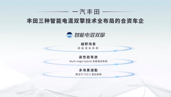 此外,在“IT'S TiME此刻 智未来”全新技术主张下,一汽丰田拥有包括智能电混双擎技术、T-Pilot智能驾驶辅助系统、Toyota Connect智能互联、Toyota Space智能座舱在内的“4T”智能化技术,并实现TNGA架构车型的全覆盖,为用户开启全新的智能科技新体验。全面的技术和产品布局,也让一汽丰田在电动化、智能化、高端化方面走在了丰田合资企业的前列。
