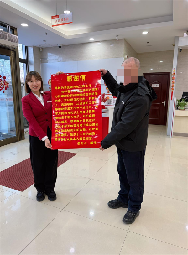 金融服务的温度,藏在点滴细节的坚守中;专业服务的价值,显在急客户之所急的行动里。2026年1月,华夏银行长沈路支行理财经理贾珺涵在日常业务办理中,凭借细致的观察与专业的服务,成功为客户追回支付宝不明自动扣款11000余元,用实际行动践行“以客户为中心”的服务理念,收获客户送来的锦旗与感谢信,成为支行优质服务的生动缩影。