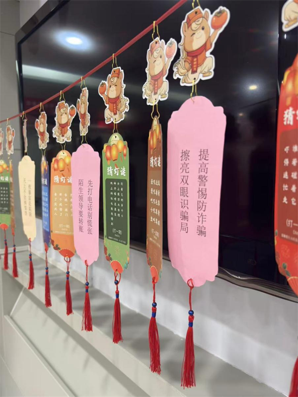 与传统灯谜会不同,本次活动的灯迷串中精心穿插了反诈知识,比如“擦亮双眼是骗局,提高警惕防诈骗”“天上不会掉馅饼,一夜暴富是陷阱”等。支行工作人员化身“反许宣传员”,在引导客户猜灯谜的同时,围绕电信网络诈骗的常见类型、作案手法及防范技巧,结合虚假投资理财、冒充客服退款、留充公检法等典型诈骗案例,用通俗易懂的语言为客户逐一讲解,吸引了前来办理业务的客户纷纷驻足参与。