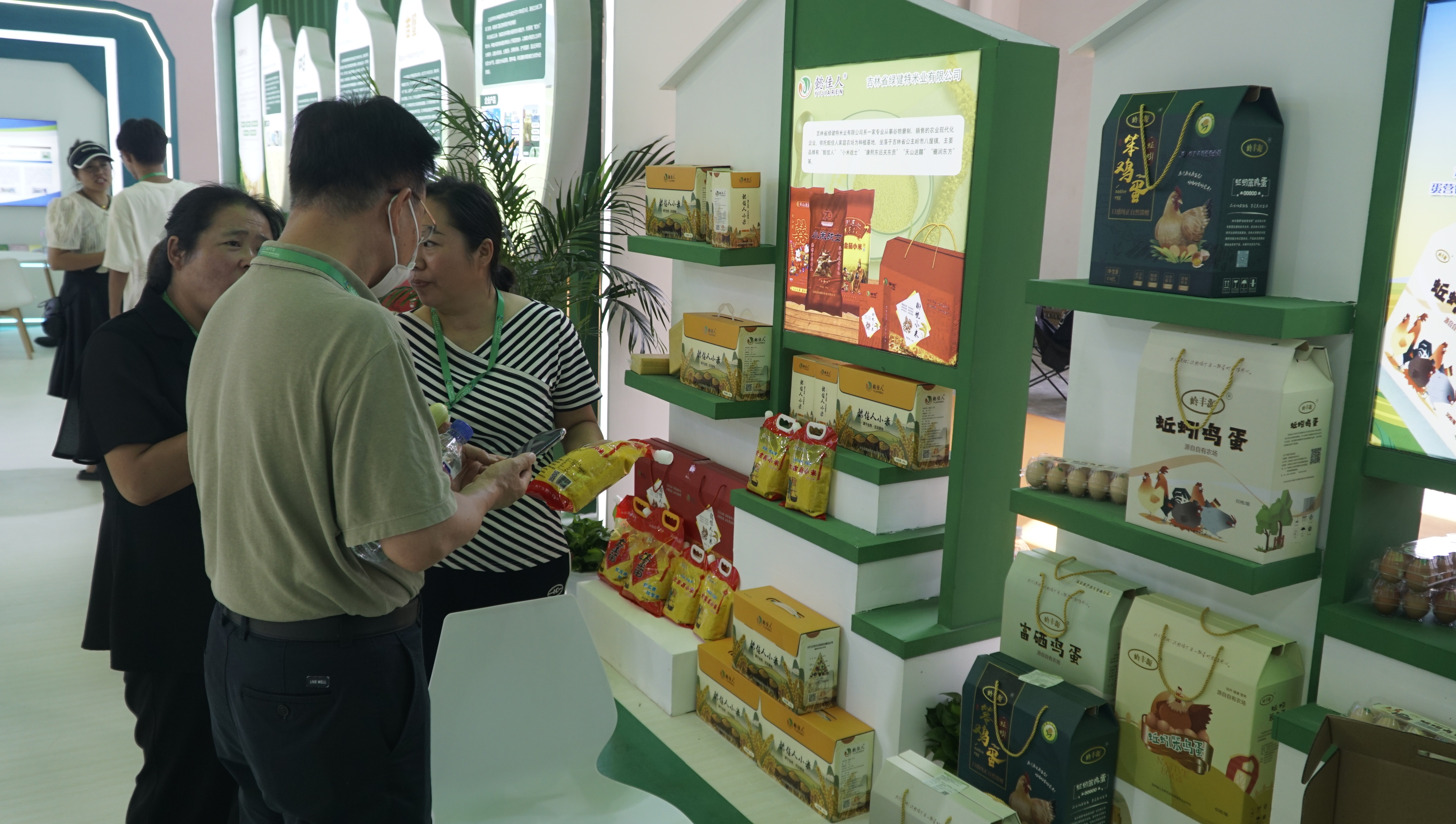 名优农产品展示区由公主岭域内25家企业及新型经营主体组成,主要包括农嫂、率鲜达、德乐、祥裕、万合、乾程、健亿、金凯乐8家鲜食玉米企业;金泰、金凯乐、华兴合作社、彦武合作社、稻田小院5家大米企业;毛城子、新怀德、申家酒坊3家白酒企业;谷庄园杂粮、九正龙须茶、赫尔苏油茶面、恒通果蔬、吉农蚯蚓鸡蛋、晋源咸菜、凯赛尔干果、福泰厨具、博古艺人手工编织9家综合企业。展示区农副产品吸引了众多参观者驻足品鉴洽谈。