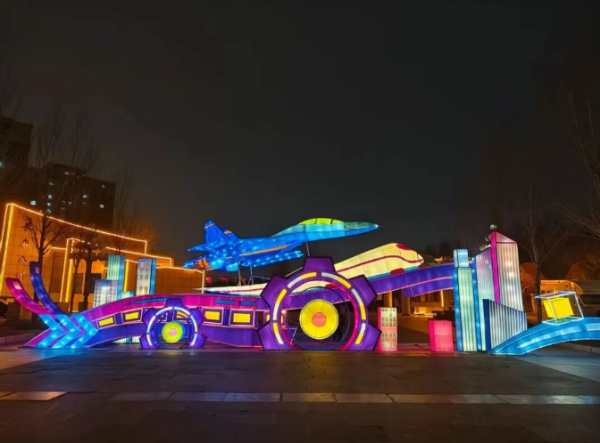 北门“逐梦蓝天”主题亮化以澄澈“航空蓝”为主调,既呼应冬日冰雪的纯净质感,更象征航空科技的前沿锋芒。流线型灯组模拟航空器翱翔轨迹,市民漫步其中,感知产业发展的强劲脉搏。