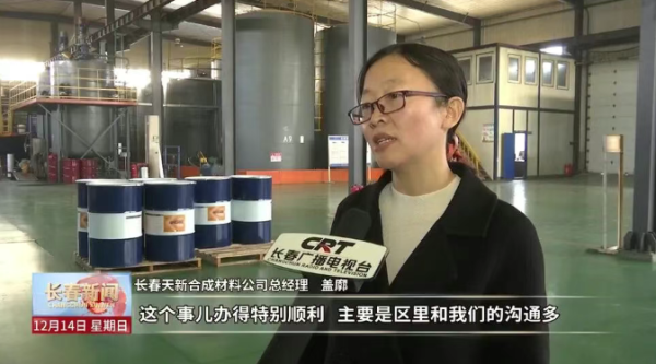 长春天新合成材料公司总经理 盖廓:这个事儿办得特别顺利,主要是区里和我们的沟通多。现场去考察我们的具体情况,想办法去帮我们解决这些问题。现在我们预计在今年12月底能够实现调试生产。整体的产值初期的时候计划是4到5亿元之间,后期的时候大概能达到10多亿元。