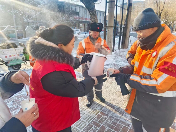 社区将阅览室设置为“环卫工人休息处”,配齐热水、纸巾等基础保障物资,为户外作业的环卫工人打造集休憩、补给于一体的暖心空间。同时组建志愿服务队,深入辖区主次干道、背街小巷,为清扫积雪作业的环卫工人送上热饮,以贴心举措驱散严寒、传递温暖。