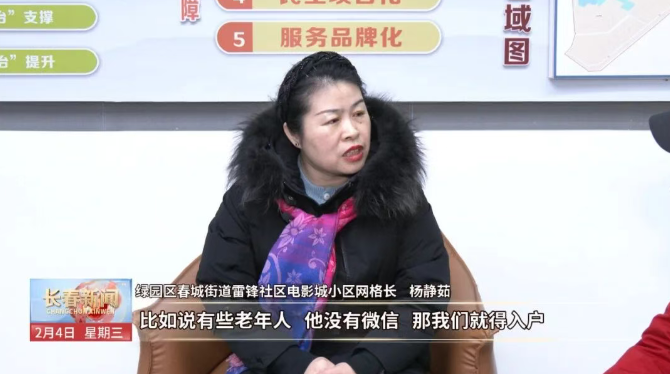 绿园区春城街道雷锋社区电影城小区网格长 杨静茹:比如说有些老年人,他没有微信,那我们就得入户。经常下户你跟居民就会建立一种感情,他就对你很信任,所以解决事情的时候他也很配合。