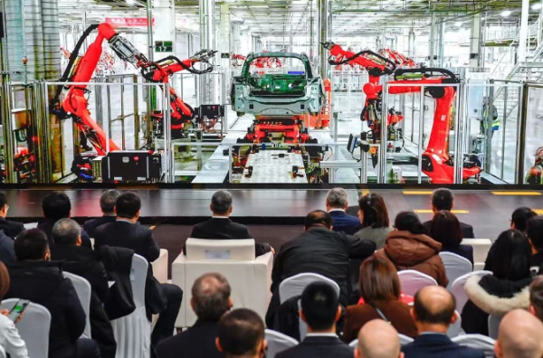 在奥迪一汽新能源公司长春基地,高度自动化的生产场景令人瞩目。12万平方米的总装车间里,看不到几名工人。物流区内,数百台自动搬运机器人精准配送物料。焊装车间824台机器人实现焊接100%自动化。300余套高精度拧紧设备覆盖整车574个关键螺栓点位。全程智能化协同作业下,每两分钟便有一台新能源汽车驶下生产线。
