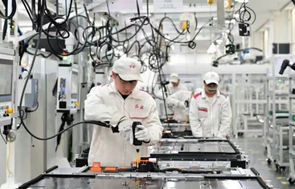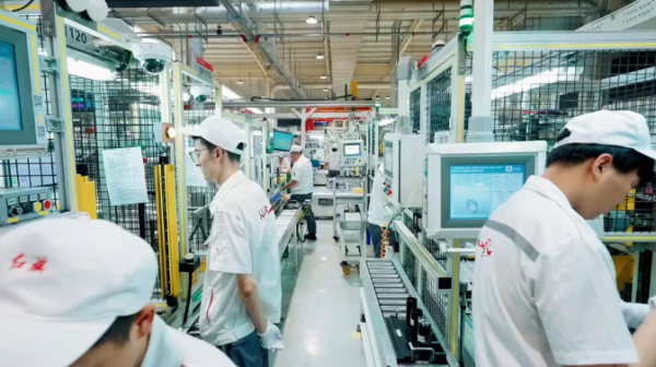 智能产线上,机械臂精准舞动,AGV小车沿预定轨迹无声穿梭,一台台新能源汽车电驱在生产线自动完成装配。
