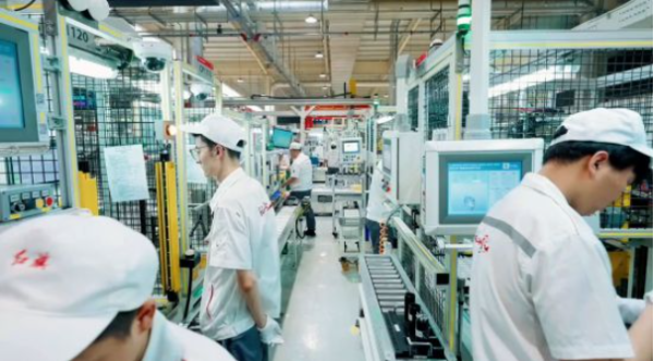 智能产线上,机械臂精准舞动,AGV小车沿预定轨迹无声穿梭,一台台新能源汽车电驱在生产线自动完成装配。