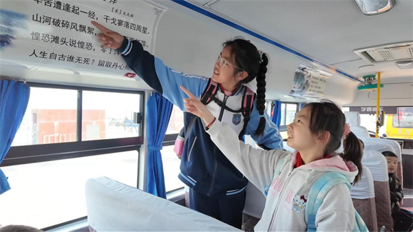 据了解,双阳区新时代文明实践中心联合区教育局,精选经典古诗词、励志警句等阅读内容,设计制作450张阅读主题宣传内容,在全区59辆校车车厢内进行布置张贴。如今,学生们在上下学的碎片化时间里,抬头可见经典、随手可学知识,在潜移默化中传承中华优秀传统文化,涵养文明素养。