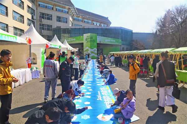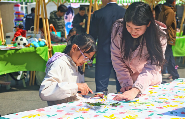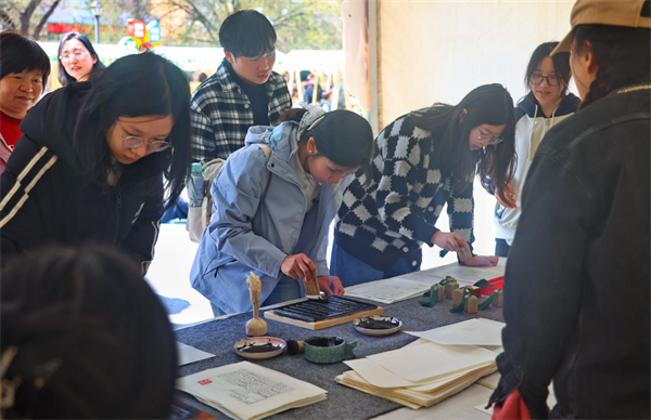 市集区的游戏摊位人气火爆。拓拓诗乐园里,孩子们用拓印工具拼贴出属于自己的小诗;花草书签乐吸引大家亲手制作花草主题书签,留住春天与书香;彩虹扭扭花摊位前,市民用彩色扭扭棒编织花朵,装点阅读时光。此外,旧书漂流、“书”菜市场、“书”式生活盲盒、古籍装帧、拓印手作以及33米大冬会长卷绘制等互动项目也深受欢迎。科技阅读体验区同样亮点纷呈,让市民在互动中感受智慧阅读的全新魅力。
